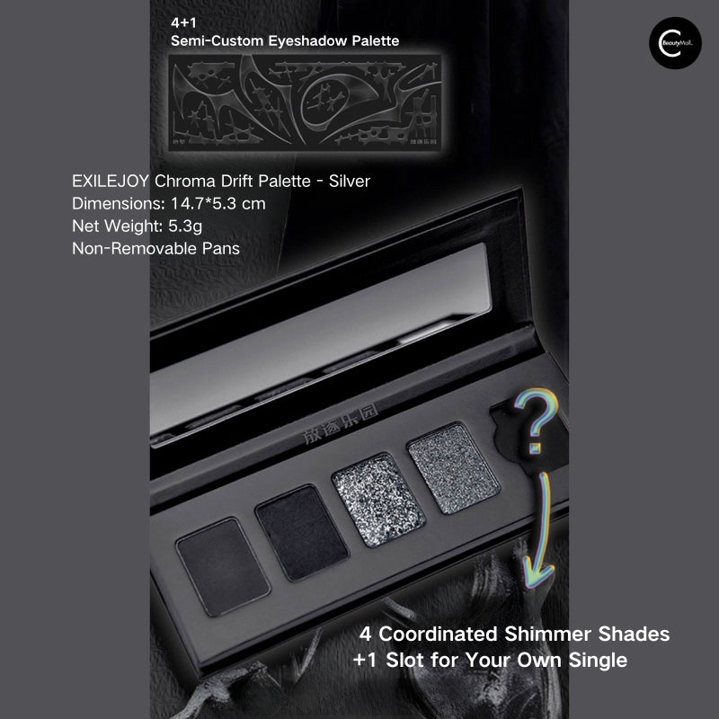 Embrace the beauty of controlled chaos with the EXILEJOY [Chroma Drift] Palette. Built on a foundation of deep, enigmatic blacks and charcoals, it features four meticulously coordinated shimmer shades, each offering a unique shift within the dark spectrum. The crowning glory is the +1 "Wildcard" slot—a blank canvas inviting you to insert your single favorite shadow, breaking the monochrome and making the palette uniquely and personally yours. This is makeup for the curator, the innovator, and the individualist.