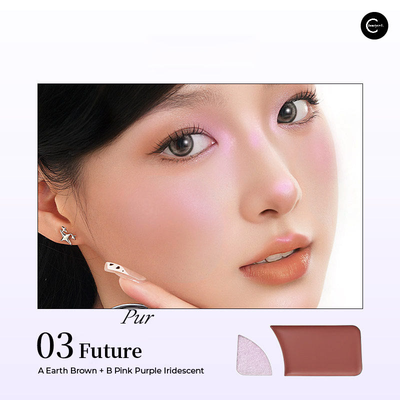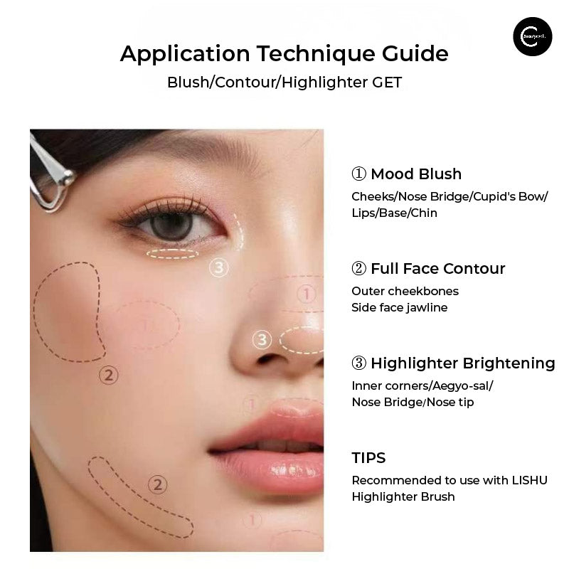 For Highlighter: Using the powder section, sweep softly across high points of the face—cheekbones, brow bones, cupid's bow, nose bridge. The fine powder texture creates translucent glossy effect without emphasizing texture.