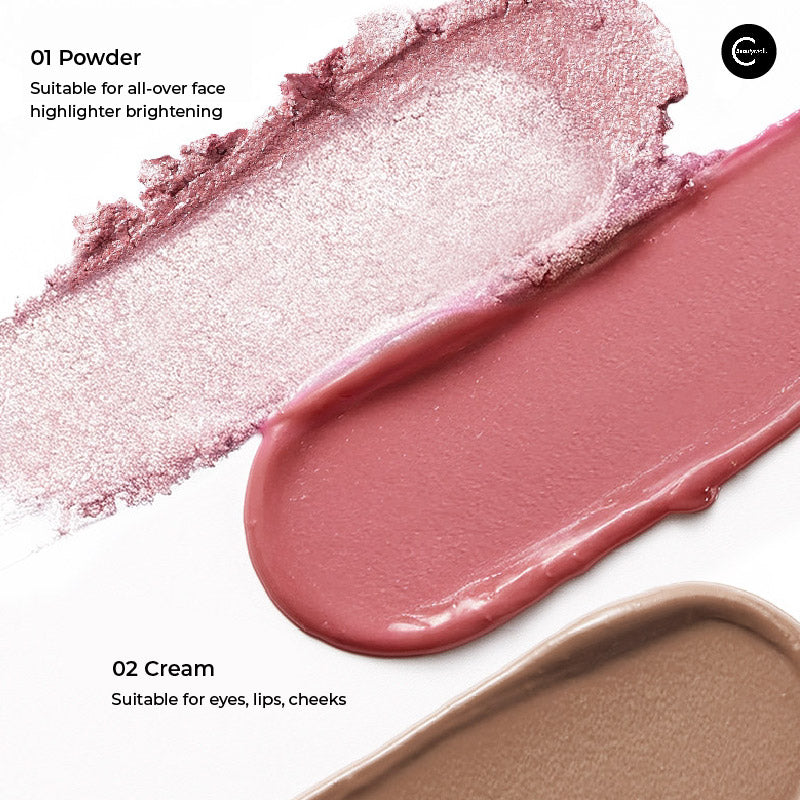 Powder Section: Designed for full-face highlighter brightening. Ultra-fine powder texture creates soft-focus luminosity without disturbing underlying makeup.