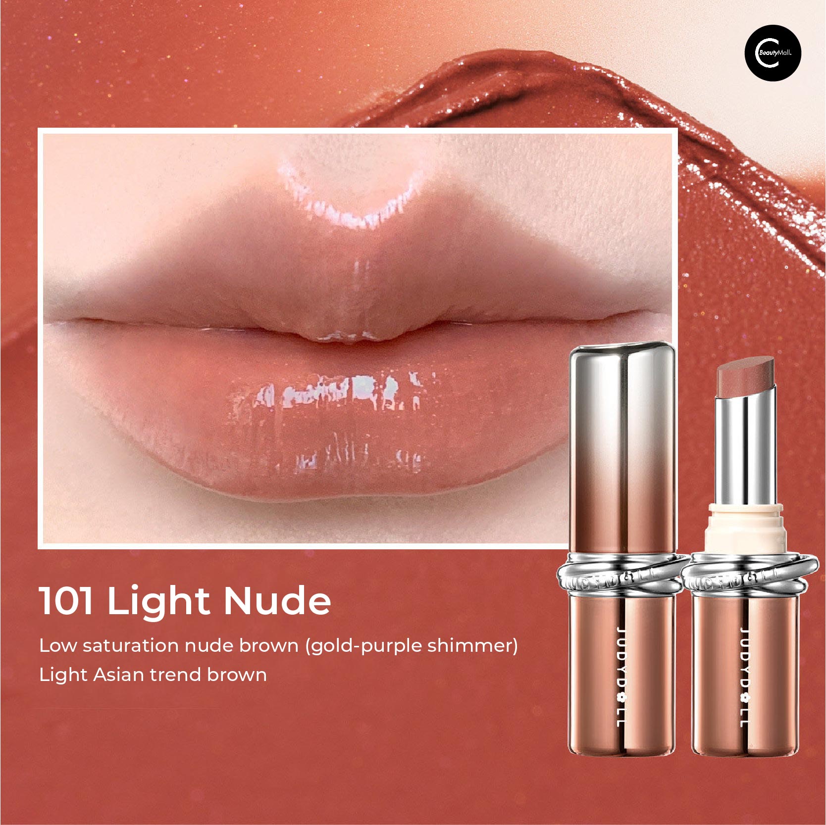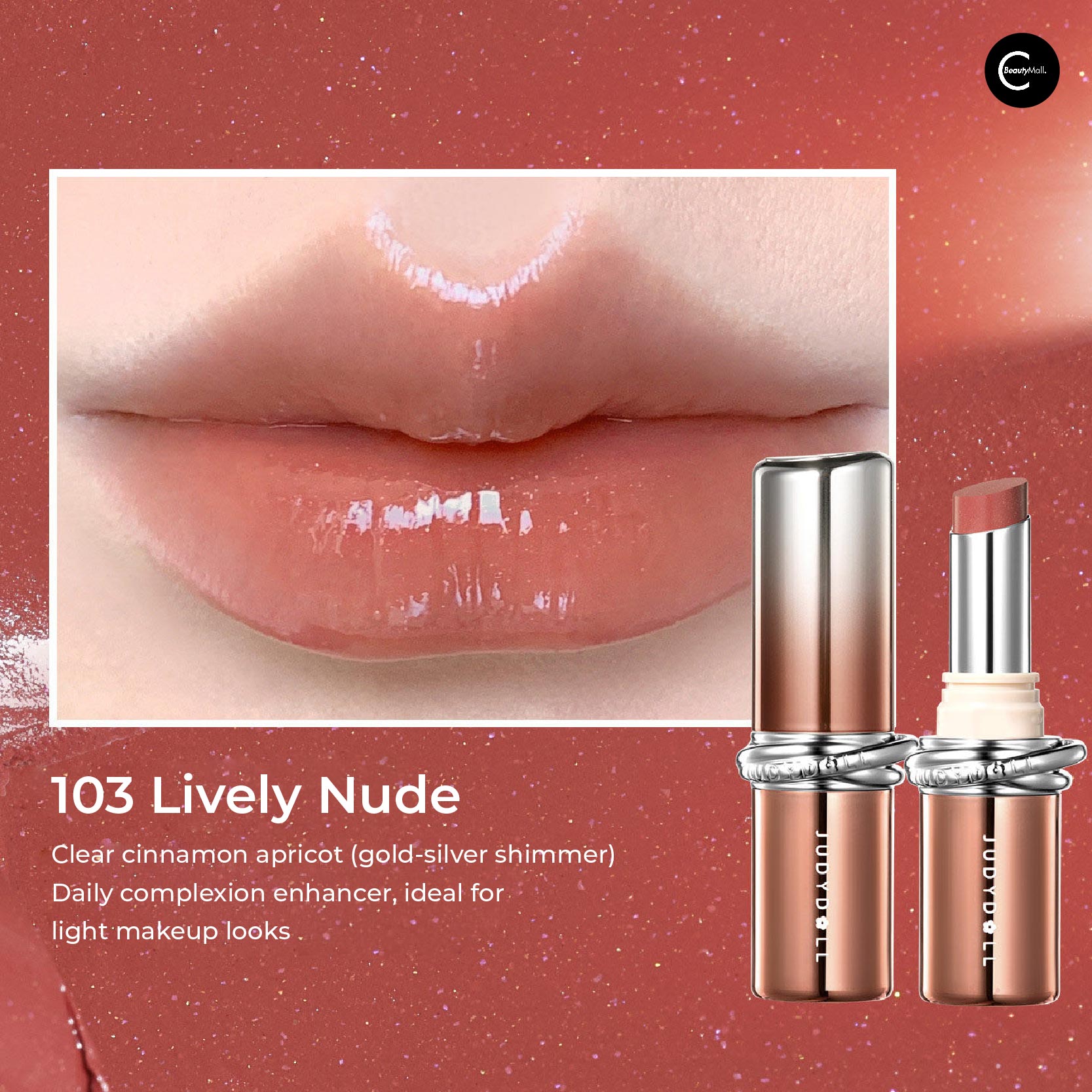 103 Lively Nude: Clear cinnamon apricot with gold-silver sparkle. Daily complexion brightener—the light-face favorite that enhances without overwhelming.