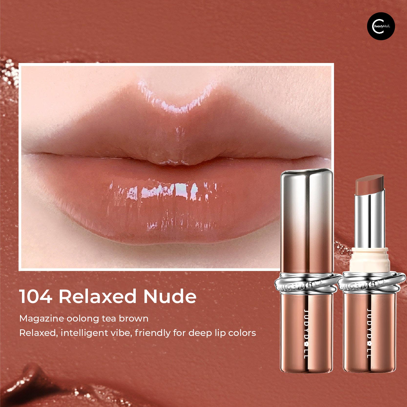 104 Relaxed Nude: Japanese lifestyle magazine oolong tea brown—the shade of relaxed intellectualism. Relaxed intellectual vibe, friendly to deeper lip colors—rich enough for deeper pigmentation, subtle enough for everyday.