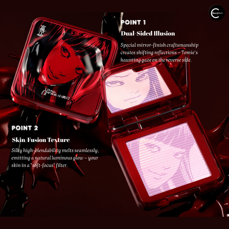 Inspired by the haunting duality of Junji Ito’s iconic character Tomie, this limited edition blush duo explores beauty that is both alluring and unsettling. Like Tomie herself—whose reflection holds a sinister secret—the compact features a mirrored, illusion-like surface that shifts as you move. Inside, two finely-milled shades capture the blush of desire and the pallor of obsession, blending to create a flush that feels like skin, yet speaks of dark romance.