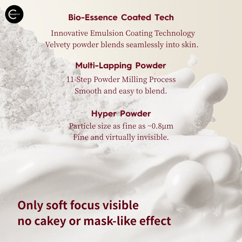 Bio-Essence Coated Technology: Innovative emulsion coating process ensures powder blends seamlessly into the skin for a velvety, second-skin finish.