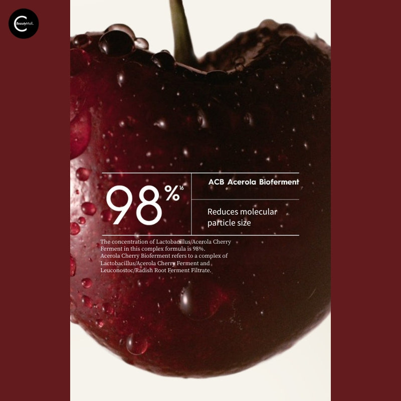 98% Acerola Bioferment Complex: Infused with ACB Acerola Bioferment to reduce molecular particle size and enhance skin compatibility.