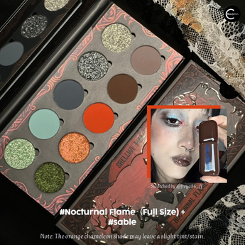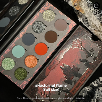 Inspired by the dark allure of a blood moon and the mystical essence of nocturnal fantasy, the Nocturnal Flame Eyeshadow Palette embodies a witch’s color grimoire. Created in collaboration with digital artist @ghoul.in.japan, this collection channels gothic romance and moonlit mystery into 10 richly pigmented shades designed for spellbinding eye looks.